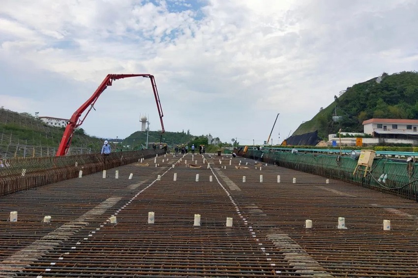 近日,貴州雙龍項目順利完成貓洞河右幅橋箱梁現(xiàn)澆混凝土。 據(jù)悉,此次箱梁澆筑采用支架現(xiàn)澆法,兩臺56m泵車配合施工,混凝土設計標號為C50,總設計方量1383m³,采用兩次澆筑,第一次澆筑底板、腹板,澆筑位置由翼緣板與底板倒角位置處以下5cm,澆筑方量為810m³,于4月19日進行施工;此次澆筑混凝土為第二次,澆筑翼緣板及頂板,涉及方量為570m³。