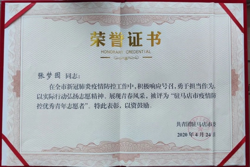 平正公司團工委榮獲“駐馬店市五四紅旗團委”稱號,辦公室(黨群辦公室)綜合干事張夢園榮獲“駐馬店市疫情防控優秀青年志愿者”稱號
