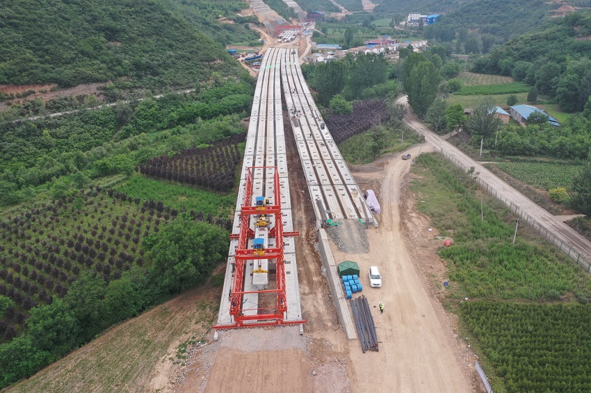 ▲花家河2號(hào)大橋預(yù)制梁架設(shè)
