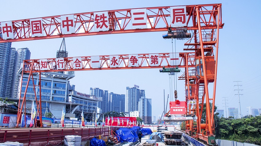 9月1日10時10分,在南寧地鐵5號線02標工程機電9工區金橋客運站鋪軌基地,軌道首鋪儀式現場彩旗飄揚,隨著“開始鋪軌”一聲令下,一節25m軌排被龍門吊穩穩吊起,緩緩下降安放至隧道內,標志著南寧地鐵5號線02標工程正式進入鋪軌大干熱潮。