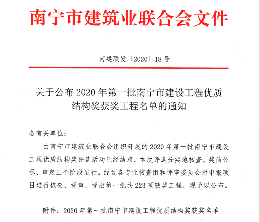 近日,南寧市建筑業(yè)聯(lián)合會(huì)公布2020年第一批南寧市建設(shè)工程優(yōu)質(zhì)結(jié)構(gòu)獎(jiǎng)獲獎(jiǎng)名單,南寧地鐵4號(hào)線02標(biāo)3個(gè)工區(qū)、5號(hào)線02標(biāo)5個(gè)工區(qū)獲此殊榮。