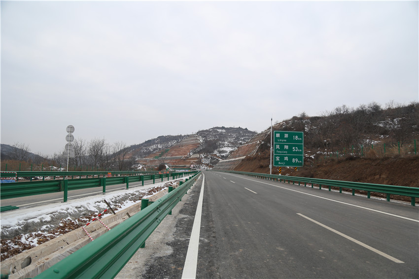 本次通車運營路段起點太峪互通位于咸陽市永壽縣太峪鄉,終點良舍互通位于寶雞市麟游縣良舍附近,開通運營里程為53.4km,開通麟游、良舍2個收費站。路段設計標準為雙向四車道,設計速度80km/h,路基寬25.5m,涉及隧道10座共26016單洞米,橋梁38座共15936.6延米,橋隧比達55.6%。