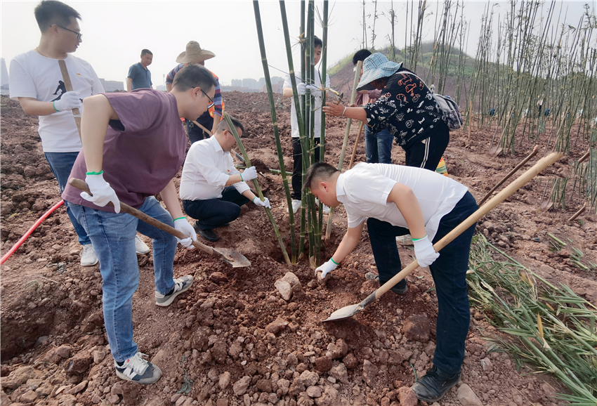 活動現(xiàn)場,全體青年集中學(xué)習(xí)了習(xí)近平總書記關(guān)于“綠水青山就是金山銀山”的理念,并在園藝老師的指導(dǎo)下,經(jīng)過竹槽開挖、竹形修理、竹根上藥、竹苗施肥、竹槽回填、竹苗澆水等流程,共同完成了20余株巨黃竹栽種。