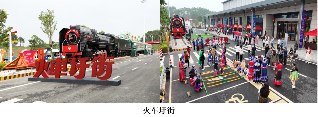 火車圩街的靈感來源于中國中鐵的鐵路文化和廣西的圩街文化,可為過往司乘游客提供“沉浸式”火車觀光休閑和購物體驗。