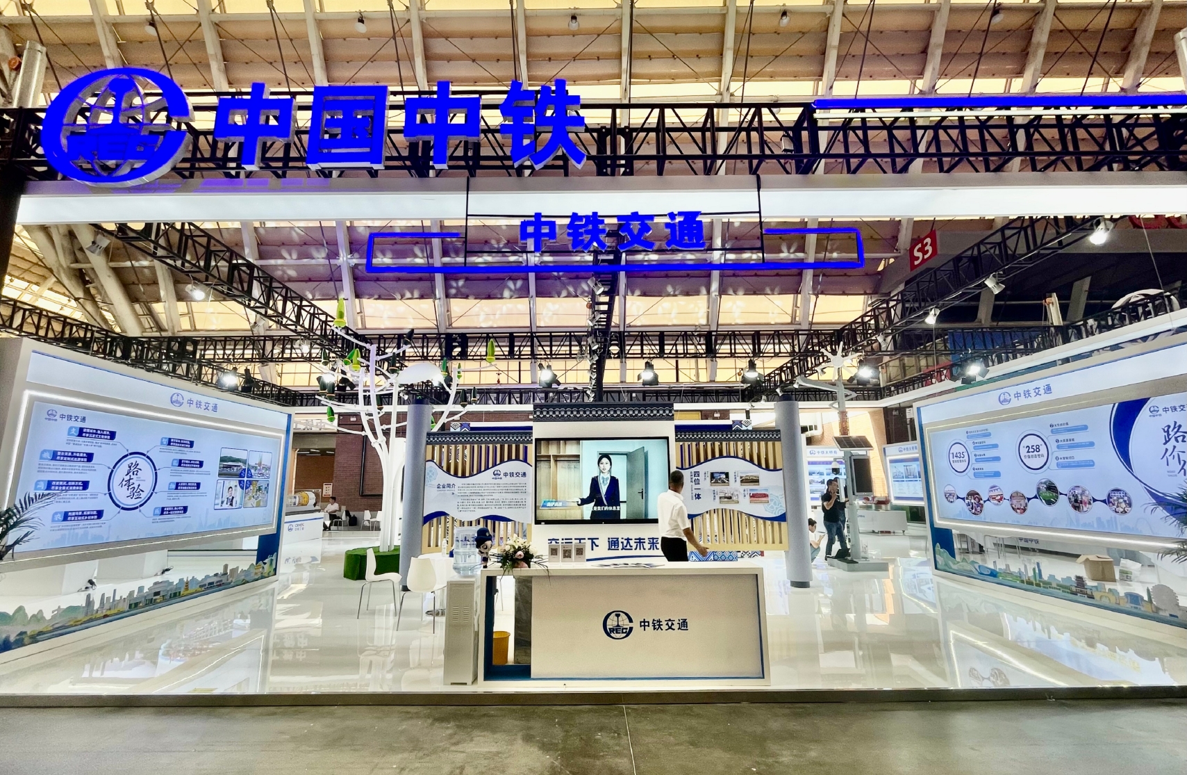 中鐵交通展區(qū)以國(guó)家綠色低碳、能源融合為理念,圍繞中鐵高速服務(wù)區(qū)“雙碳”目標(biāo),展示了風(fēng)光能源樹(shù)及智慧燈桿,通過(guò)風(fēng)能光伏發(fā)電、智慧照明、環(huán)境信息采集、信息發(fā)布、5G微基站、手機(jī)充電、智慧交通等功能,實(shí)現(xiàn)多場(chǎng)景消納和低成本綠色能源供給,切實(shí)推動(dòng)高速公路從能源需求向能源供給轉(zhuǎn)變,打造“零碳收費(fèi)站”“零碳服務(wù)區(qū)”。中鐵交通、中鐵長(zhǎng)江設(shè)計(jì)院設(shè)置了“中鐵高速數(shù)智運(yùn)維”沙盤(pán),通過(guò)展示“空、天、地”一體化檢測(cè)監(jiān)測(cè)體系、成套智能檢測(cè)裝備、高速通智慧管養(yǎng)平臺(tái)、結(jié)構(gòu)監(jiān)測(cè)云平臺(tái)、新材料應(yīng)用等內(nèi)容,全面展示了高速公路設(shè)計(jì)、建設(shè)、運(yùn)營(yíng)等全生命周期管理過(guò)程,進(jìn)一步打造高速公路新質(zhì)生產(chǎn)力。